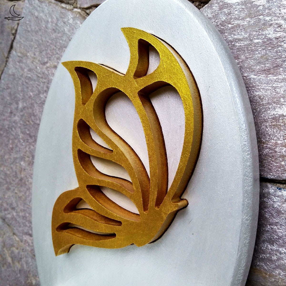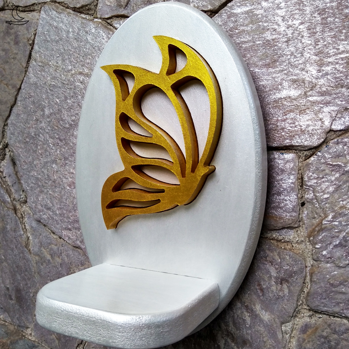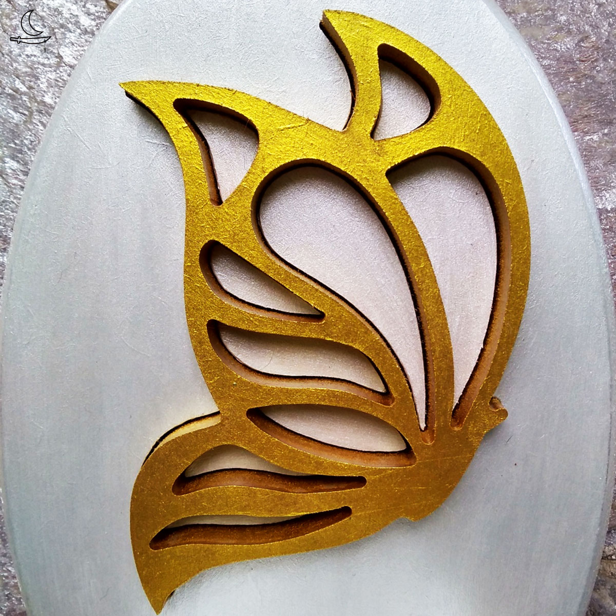 Base branca metalizada, Borboleta incrustada em amarelo metalizado. Verniz incolor para proteção