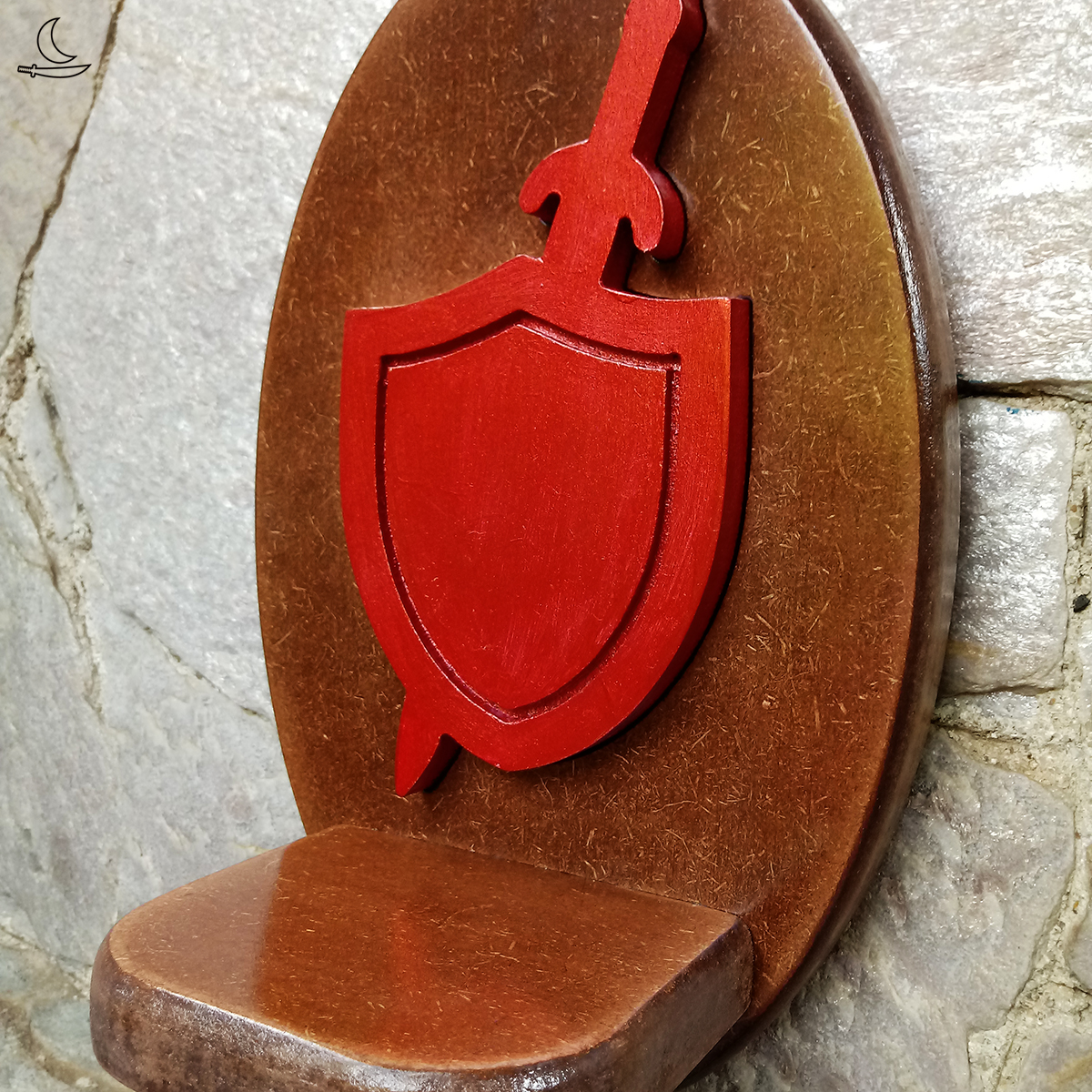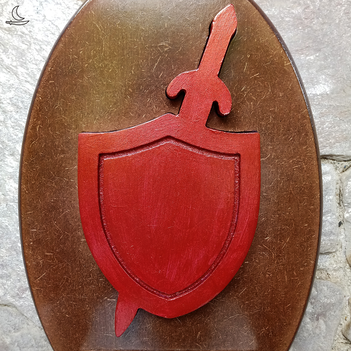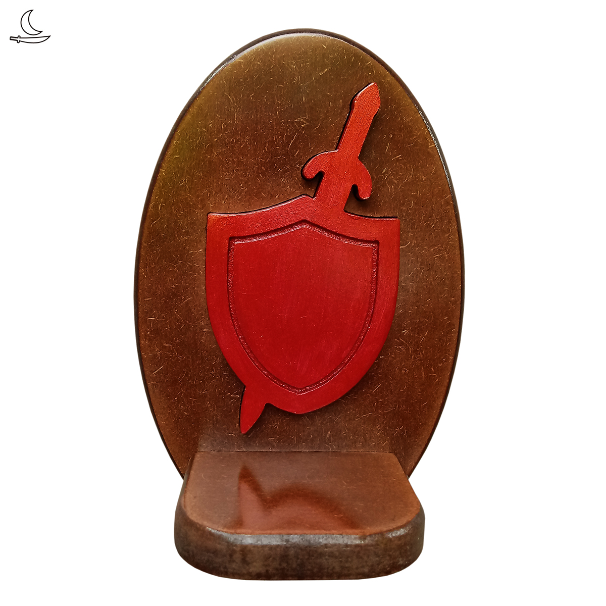 Base imbuia, Escudo incrustado em vermelho metalizado. Verniz incolor para proteção